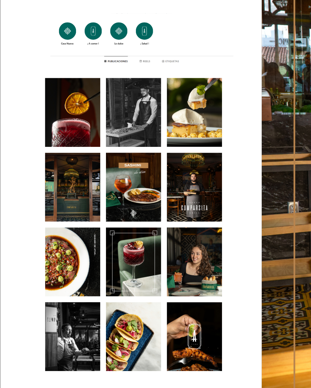 - Parrilla de contenido con captions y hashtags